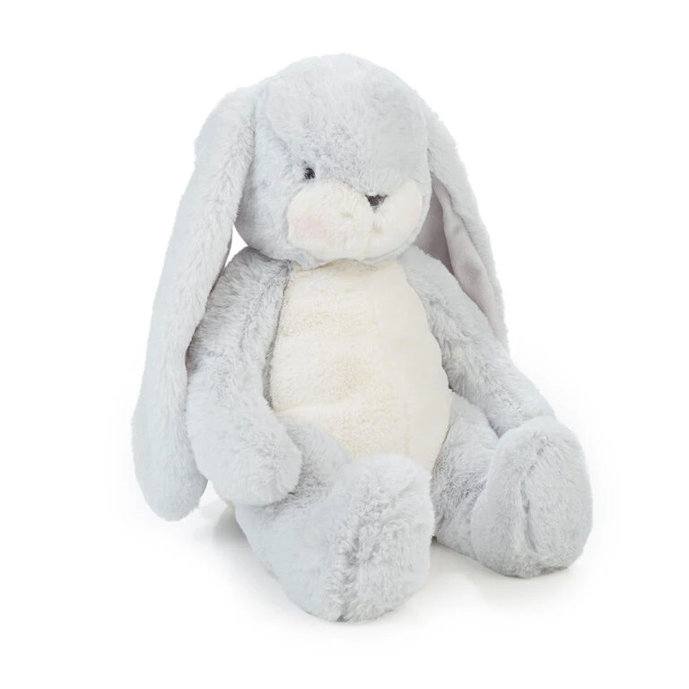 - Gray bunny stuffed animal from Bunnies by the Bay is made of plush, polyester fabric.
